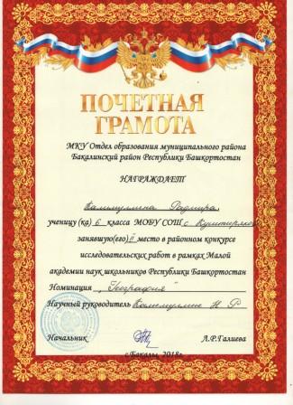 Калимуллин Радмир - ученик года, 2-е место по району